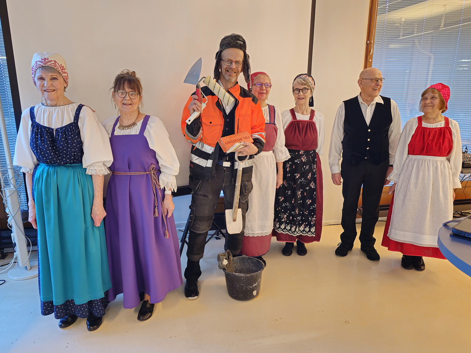 Samassa kerhotilaisuudessa pani Ranttali-tanhuryhmä Ritva Kentän johdolla rytmikkäästi liikettä yleisöön tuolijumpan merkeissä.