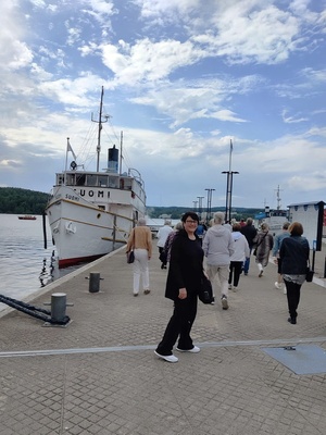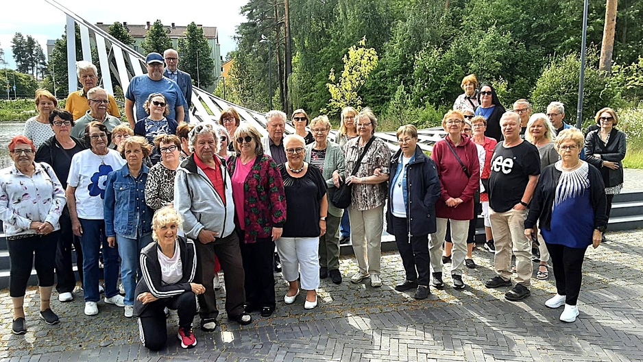 ![]() Lavis-kerho vauhdissa Värtön tanssisalissa. | ![]() Kulttuurikerholaisia tutustumassa Hupisaarten puihin Esko Salosen opastuksella. |